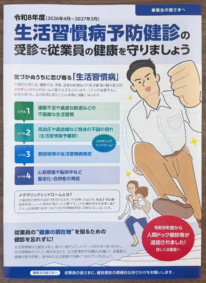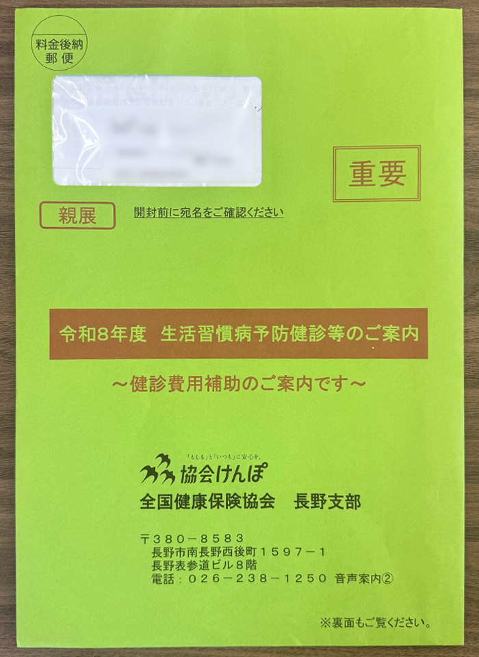 【労務ご担当者様へ】令和8年度生活習慣病予防健診のご案内について 2026.04.01 お知らせ 全国健康保険協会より、事業者様宛にお送りした緑色の封筒に同封されている「健診対象者一覧」の名簿は、健診お申し込み時に必要となりますので、必ずお手元に保管していただきますようお願いいたします。 ↑この緑色の封筒は大切に保管してください